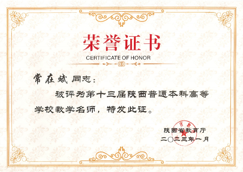 陕西普通本科高等学校教学名师奖是陕西高校优秀教师的重要奖项,是建设高水平教师队伍、全面提高人才培养质量的重要举措。旨在表彰教师不忘初心、牢记使命,立足教学一线,不断推进教育教学观念更新,改革教学内容和教学方法,促进课程建设、教学团队建设,为高等教育事业作出的成绩,激励广大教师争做新时代“四有”好老师,当好学生四个“引路人”,做“经师”和“人师”的统一者。