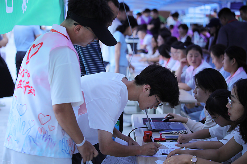 在报到现场,身着志愿服务马甲的志愿者们穿梭如风