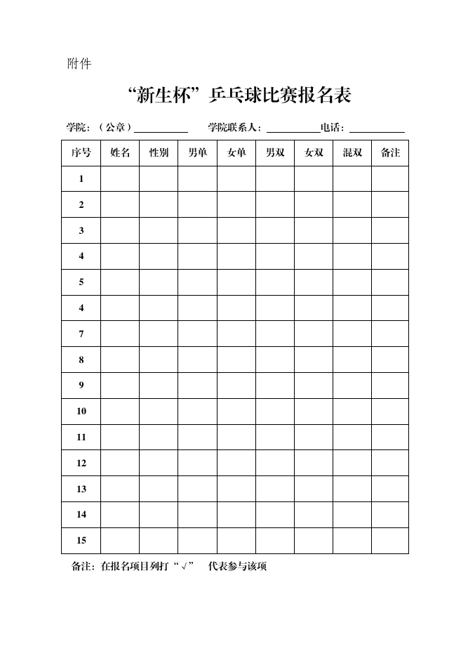 以二级分院为单位组队参赛,单打项目每学院最多报十人,双打(项目)每学院最多报五队,每名运动员最多兼两项;将纸质报名表(见附件)加盖学院公章于2024年9月19日前交至文体馆202王小妮老师处,电子版发送376320948@qq.com。报名表见附件。