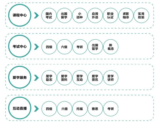 为满足不同用户的需求,新东方自主研发上百种产品,满足国内外考试、应用外语、实用技能、职业认证、求职指导等需求。同时将平台划分成:课程中心、考试中心、爱学服务和互动直播。