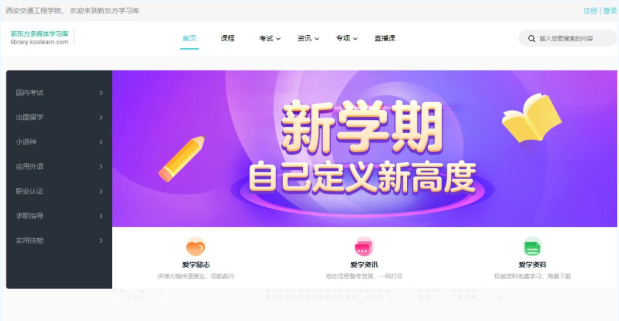 简介:新东方多媒体学习库(library.koolearn.com)是集在线测评,网络课堂、在线考试、多媒体互动平台为一体的“一站式”综合学习平台。该平台依托于新东方教育科技集团的强大师资力量与教学资源,拥有中国最先进的教学内容开发与制作团队,并结合网络学习的先进理念及信息化技术手段,致力于为高校在校大学生提供卓越的个性化、互动化、智能化的在线学习体验。