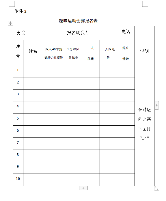 活动项目:四人40米抱球接力往返跑、1分钟仰卧起坐、三人跳绳(两人摇绳一人跳)、三人四足跑、蛇来运转(每人限参与两项)