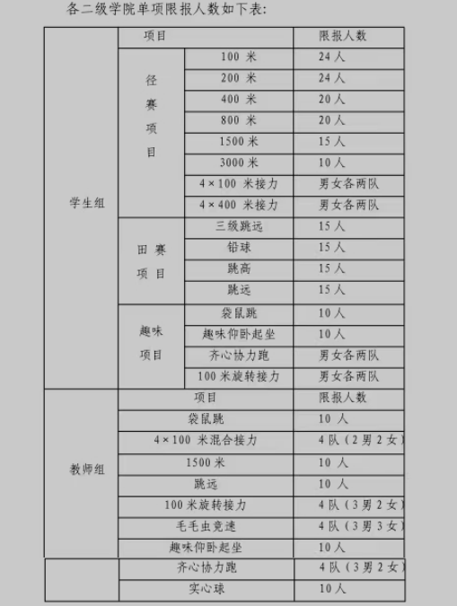 4.接力赛各学院最多限报四队(男女各两队),各队参赛队员必须为运动员。