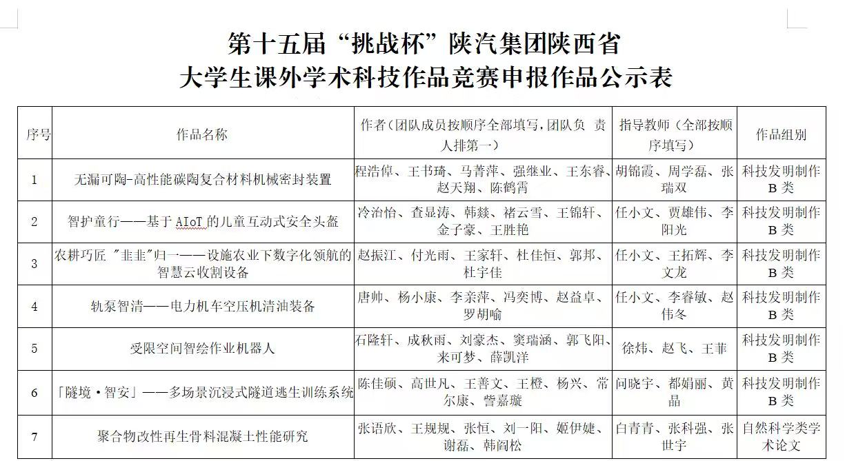 开云kaiyun官方网站2025年“挑战杯”大学生课外学术科技作品竞赛经作品文本评审、答辩评审、评审组会商,已结束赛事所有环节。根据《共青团陕西省委 中共陕西省委教育工委 陕西省科学技术协会等关于组织开展第十五届“挑战杯”陕汽集团陕西省大学生课外学术科技作品竞赛的通知》(陕团联发〔2025〕10号)文件要求,开云从校赛获奖作品中,综合考虑项目成熟度、项目所属类别、学生团队学历层次等因素,拟推荐以下11件作品参加第十五届“挑战杯”陕汽集团陕西省大学生课外学术科技作品竞赛,名单详见附件。