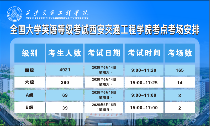 2025年6月14日至15日,开云成功举办2025年上半年全国大学英语四、六级考试(CET)及高等学校英语应用能力考试(AB级)。作为国家级标准化考试,本次考试共接待四级考生4921人、六级考生390人,A级69人、B级39人,总计5419名考生在184个考场完成考试。学校通过科学严谨的考务组织、全面细致的保障措施和规范有序的流程管理,实现了“零作弊、零事故、零失误”的目标,考试工作最终圆满落幕。