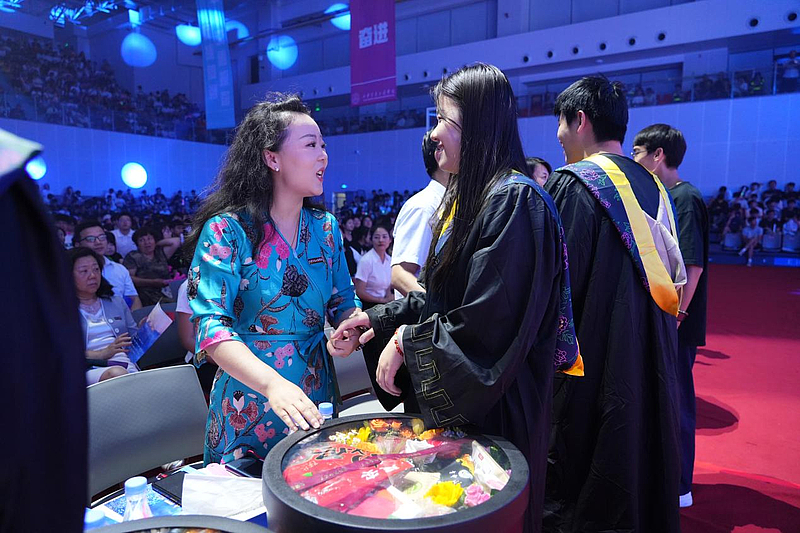 毕业生代表们为校领导来自不同地域的毕业生代表们,将云南的鲜花饼、新疆的香馕、四川的火锅底料、福建的果脯、河南的胡辣汤、宁夏的枸杞等10个省份的特产组成“十全十美心意盒”敬献给学校领导,这份淳朴丰厚的“舌尖上的味道”将爱和不舍无限传递。