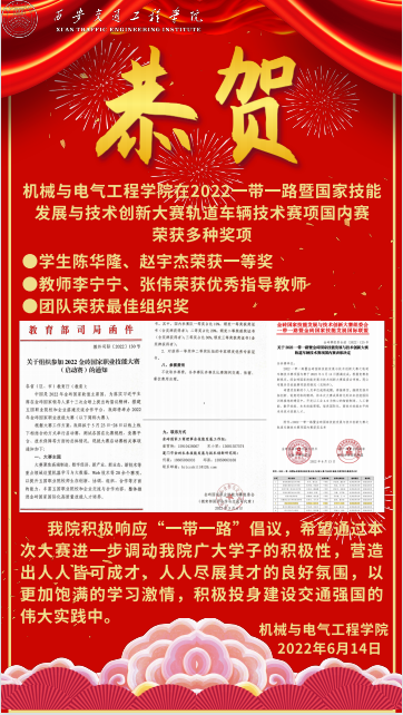 6月13日,2022一带一路暨金砖国家技能发展与技术创新大赛轨道车辆技术赛项国内赛表彰决定传来喜讯,机械与电气工程学院轨道车辆学生陈华隆、赵宇杰荣获比赛一等奖,教师李宁宁、张伟荣获优秀指导教师,团队荣获最佳组织奖。