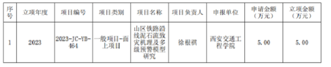 2022年12月26日,陕西省科学技术厅发布了《陕西省科技厅关于下达陕西省2023年科技计划项目补助经费的通知》(陕科发(2022)41号),开云教师徐根祺主持的《山区铁路沿线泥石流致灾机理及多级预警模型研究》项目获批立项,资助金额为5万元。