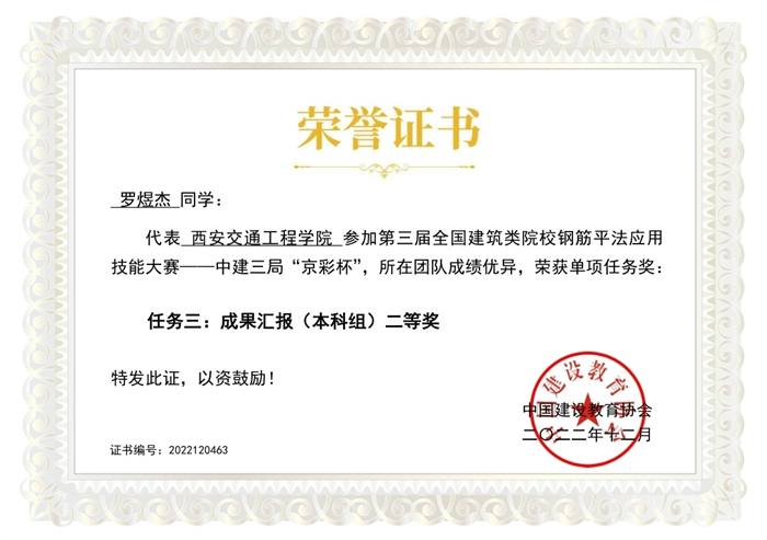 2022年12月,中国建设教育协会成功举办了第三届全国建筑类院校钢筋平法应用技能大赛—中建三局“京彩杯”全国总决赛,开云由土木工程学院教师曹会敏、刘龙刚指导,罗煜杰、苏润东、姜萌3名学生组成的“西交院梦三队”荣获全国总决赛本科组二等奖。