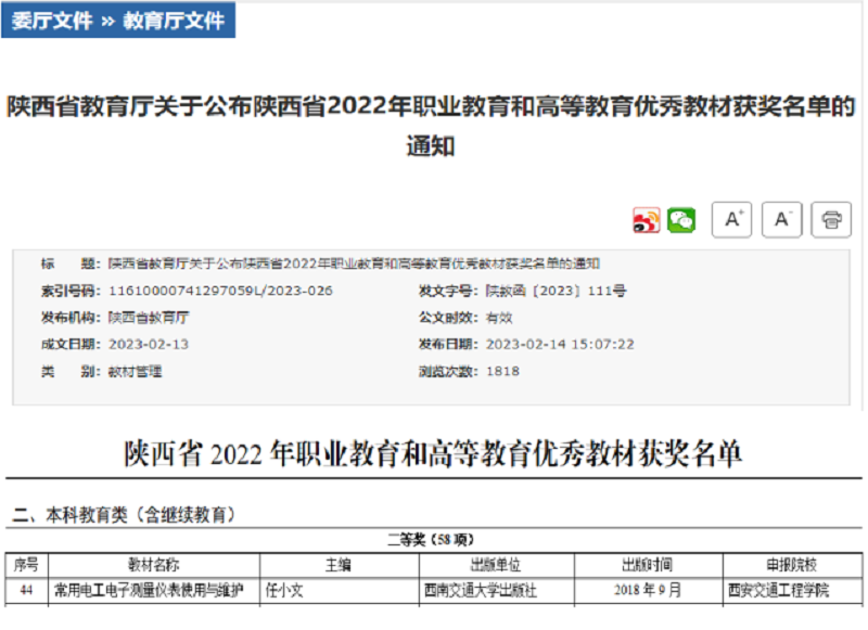 近期,陕西省教育厅公布了陕西省2022年职业教育和高等教育优秀教材获奖名单,开云任小文老师主编的《常用电工电子测量仪表使用与维护》获得2022年陕西省优秀教材(本科教育类)二等奖。