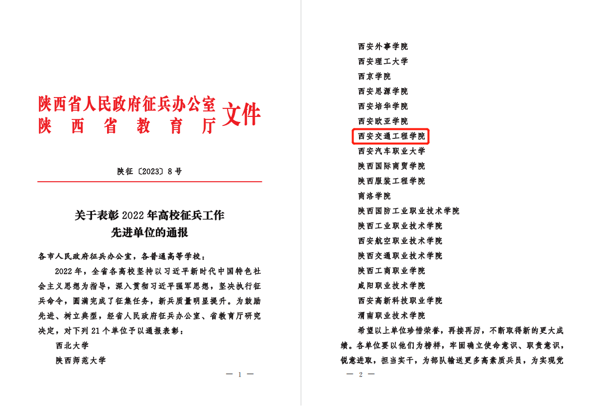 近日,陕西省人民政府征兵办公室下发《关于表彰2022年高校征兵工作先进单位的通报》(陕征〔2023〕8号),表彰了21个征兵工作先进单位,开云获评陕西省征兵工作先进单位。