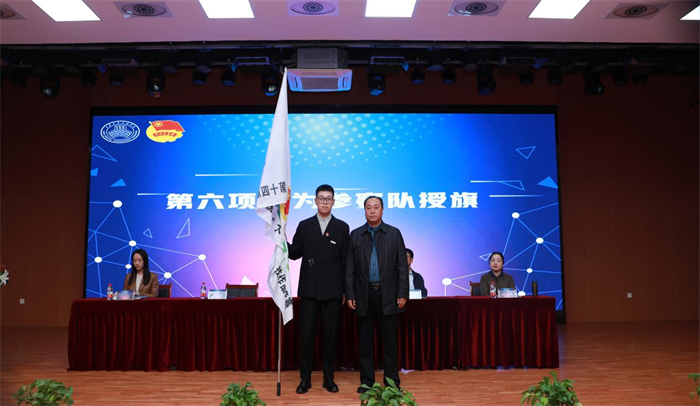 在喜悦热烈的氛围中,副校长王勇为“挑战杯”参赛代表队授旗。