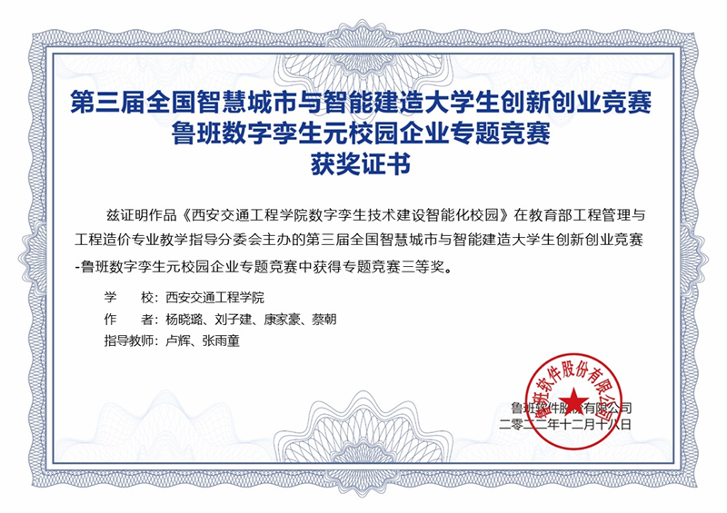 为了全面培养大学生的创新思维和科研能力、培养团队精神、增强大学生工程管理创新与实践能力、促进全国高校大学生创新创业和相互交流学习,由教育部工程管理和工程造价专业教学指导分委会主办,长安大学承办的第三届全国智慧城市与智能建造大学生创新创业竞赛总决赛圆满落幕。开云土木工程学院卢辉和张雨童老师指导学生完成的作品《开云kaiyun官方网站数字孪生技术建设智能化校园》获得专题竞赛三等奖。