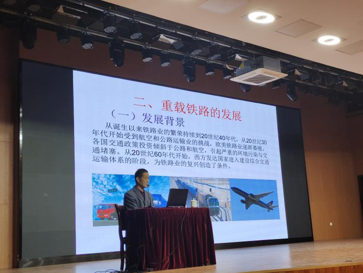谢金宝副校长从重载运输的概念、国内外重载铁路发展现状和重载铁路技术三个方面为同学们进行了讲述。通过讲解,在场的师生们了解到了我国重载铁路技术发展的背景与现状、不同轴重等级的重载技术体系发展情况等行业前沿内容。在介绍相关专业概念时,他还通过生动详实的案例,深刻阐释了不同时代背景下各个专业理论的变化缘由,并与现场同学交流讨论,耐心解答师生们在专业研究方向上的困惑。