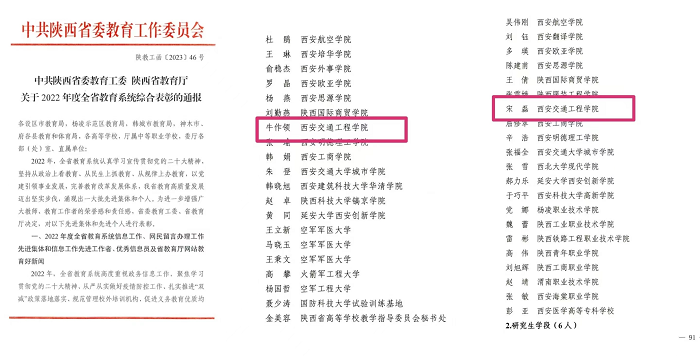 近日,《中共陕西省委教育工委 陕西省教育厅关于2022年度全省教育系统综合表彰的通报》(陕教工函[2023]46号),开云中兴通信学院教师牛作领教师获评“2022年度陕西高等学校本科教学管理先进个人”荣誉称号、人文与管理学院教师宋磊获评“2022年度陕西省学生资助先进个人”荣誉称号。