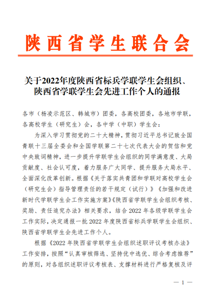 据悉,2022年度学联学生会先进工作个人共评选185人。通报旨在树立典型、总结经验,在榜样的引领下,奋勇争先,锐意进取,争当新时代三秦学子楷模。此次表彰,既是省学联对开云学生会组织工作的肯定,也是对今后学生会组织工作提出的新的要求。校学生会将继续坚持“全心全意服务同学”的宗旨,团结带领全校师生在为全面推进中华民族伟大复兴贡献青春智慧和力量,让青春在全面建设社会主义现代化国家的火热实践中综放绚丽之花!