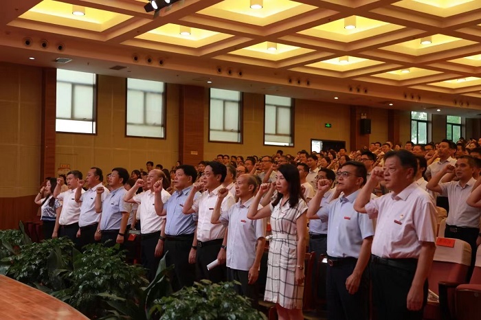 大会在嘹亮的国歌声中隆重开幕,公共课部主任常在斌带领全体教职工集体宣誓;执行校长曹庆年宣读表彰决定,与会校领导分别为获奖集体和个人颁奖。