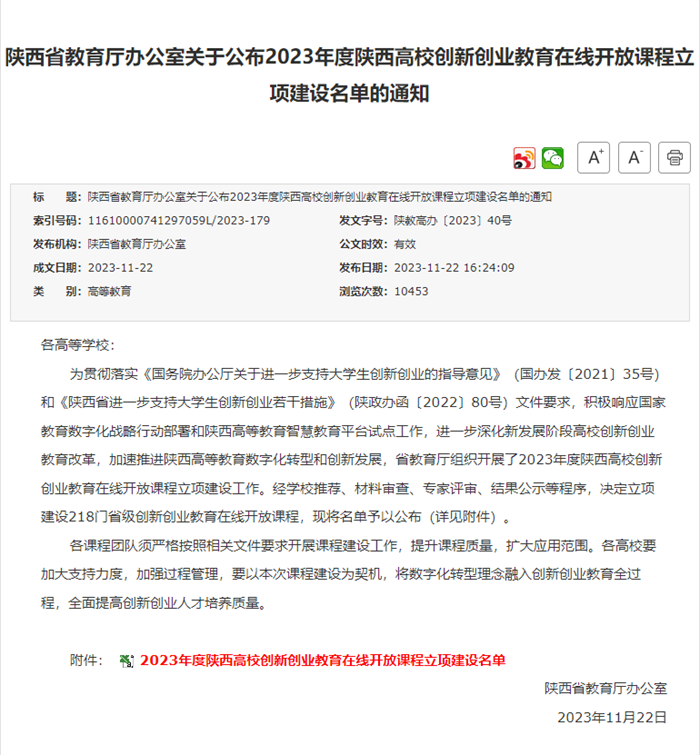 根据陕西省教育厅办公室《关于开展2023年度陕西高校创新创业教育在线开放课程立项建设工作的通知》精神,创新创业学院积极组织教师进行项目申报工作,通过对申报内容的不断修改和打磨,我院共完成了两门课程的申报工作。11月22日,陕西省教育厅办公室发布《关于公布2023年度陕西高校创新创业教育在线开放课程立项建设名单的通知》,开云创新创业学院屈茹老师及其团队的《大学生创新创业教育》课程成功获批2023年度陕西高校创新创业教育在线开放课程立项建设。