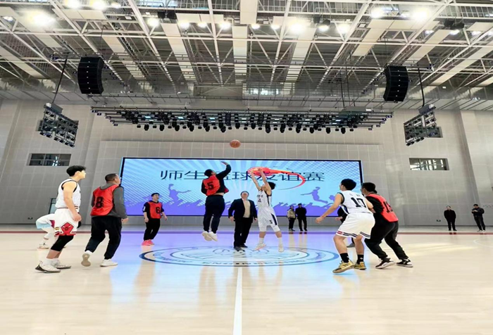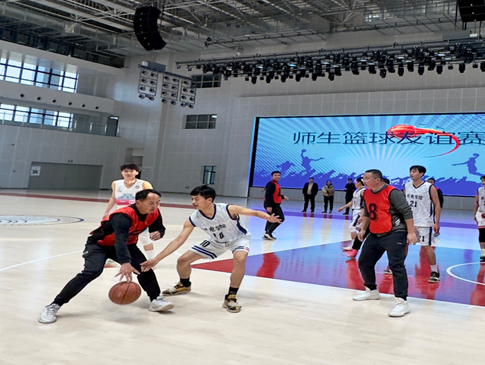 本次比赛由学生篮球赛冠军队和教职工联队之间展开较量。比赛过程中,学生队员们展现出扎实的个人技能、逆风也不服输的精神、对抗时的沉稳睿智,教师队伍中每个人的强劲实力和他们攻守搭配的默契配合。队员们运球的同时积极开展防守,你争我抢,你追我赶,闪转腾挪,场上队员迎“篮”而上,熟练运球、突破、拼抢、反攻、上篮,动作行云流水,两支队伍均展现了默契的配合和团队的力量。场上裁判员们公正无私,判断专业无争议。场下观众们全神贯注地观看每一个精彩瞬间,加油声此起彼伏,而在球迷的加油、呐喊和欢呼声中,现场氛围持续高涨。