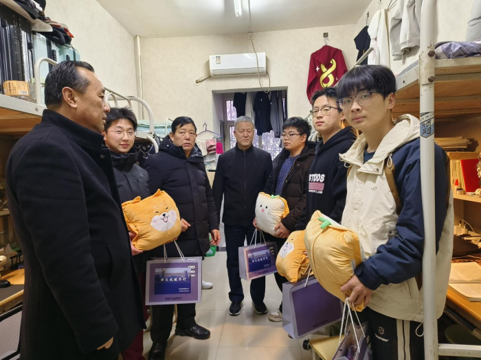 慰问过程中,校长刘建朝、副校长王勇一行来到部分学生宿舍,为学生送上亲切关怀和冬季慰问品,同时就学生的学习、生活、宿舍环境等方面与同学们暖心交流。校长刘建朝鼓励学生要自信自强,在学期末能够认真复习和备考,争取取得一个好成绩,同时希望同学们要积极发扬不怕吃苦、敢于吃苦的精神,不断丰富和提升自我,争取早日实现个人理想和价值。副校长王勇细致地询问了同学们的生活情况,就居住环境、室友关系等和同学们进行了亲切交流,尤其叮嘱同学们天气降温,要注意防寒保暖。同学们纷纷表示感谢,在寒冷的冬日切身感受到了学校领导和老师的关怀、同学们的热心帮助,并表示今后一定会努力学习,用实际行动回馈学校和社会。