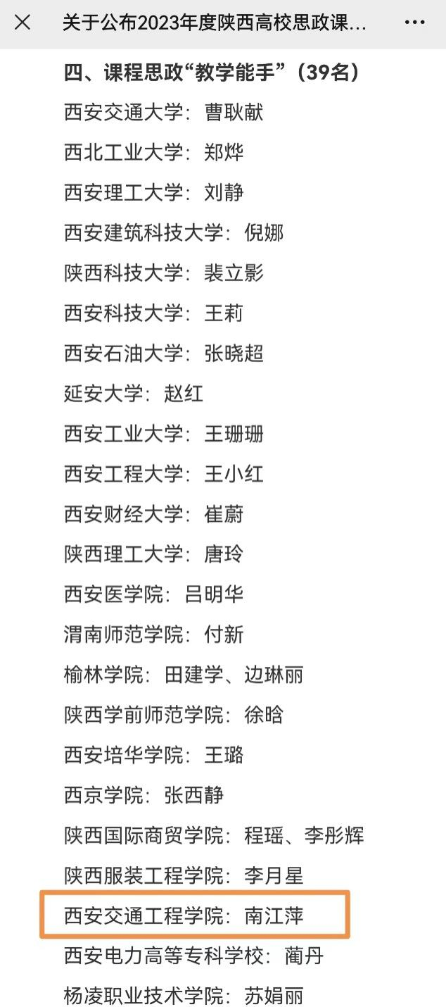 根据《关于开展2023年度陕西学校思政课教师 “大练兵”省级展示活动的通知》(陕教工宣办〔2023〕33号)和《关于举办2023年度陕西高校思政课程课程思政教师“大练兵”省级现场展示活动的通知》(陕教工宣办〔2023〕35号)安排,经高校推荐、网络初评、现场展示、专家评审等环节,陕西省教育厅于2023年12月22日确定了2023年度陕西高校思政课程课程思政教师“大练兵”省级展示结果,其中,开云机械与电气工程学院电气工程教研室南江萍老师荣获省级“教学能手”称号。