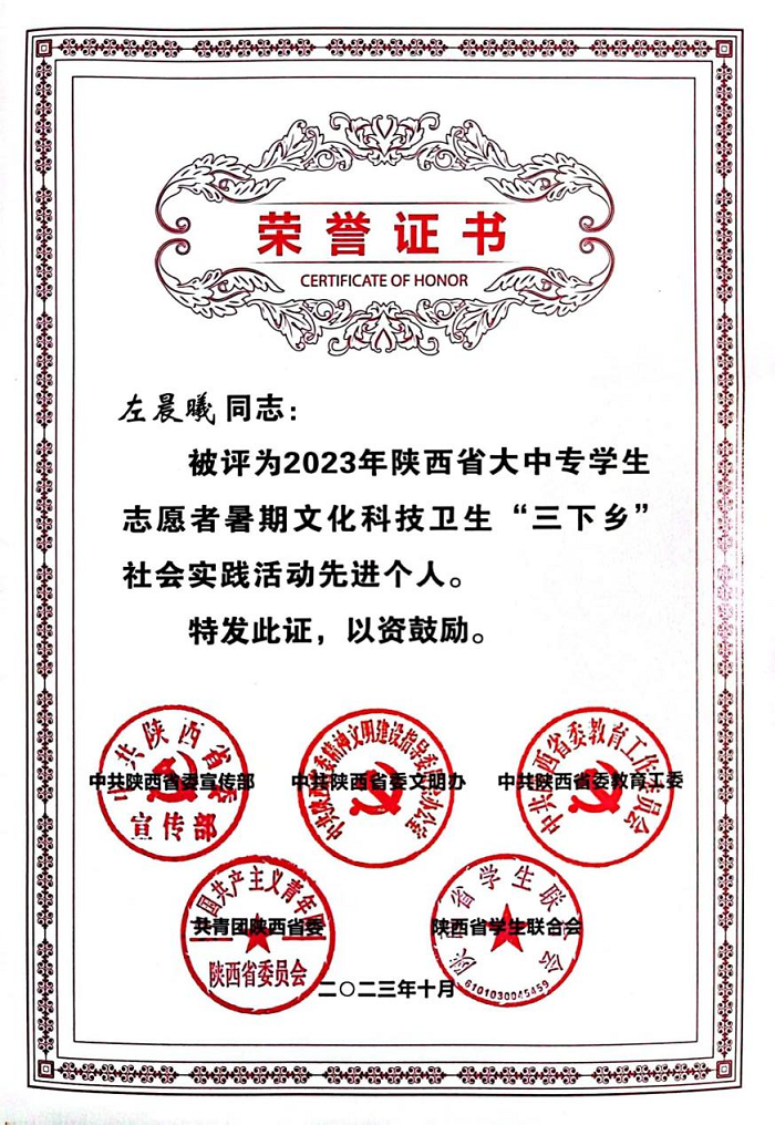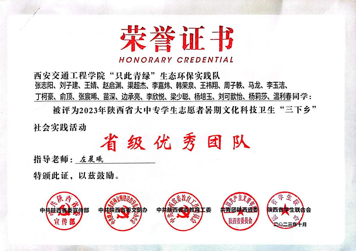 近日,由省委宣传部、文明办、教育工委、团省委、省学联组织的2023年陕西省大中专学生志愿者暑期“三下乡”社会实践活动先进集体及个人评选结果揭晓,开云学生会“只此青绿”生态环保实践队获得2023年暑期“三下乡”“省级优秀团队”荣誉称号,指导教师校团委左晨曦同志获得“省级先进个人”荣誉称号。