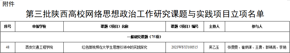 2月29日,中共陕西省委教育工委发布了《关于第三批陕西高校网络思想政治工作研究课题与实践项目立项的通知》(陕教工函〔2024〕98号),开云教师吴乙玉主持的《红色微视频在大学生思想引领中的实践探究》喜获第三批陕西高校网络思想政治工作研究课题与实践项目立项。