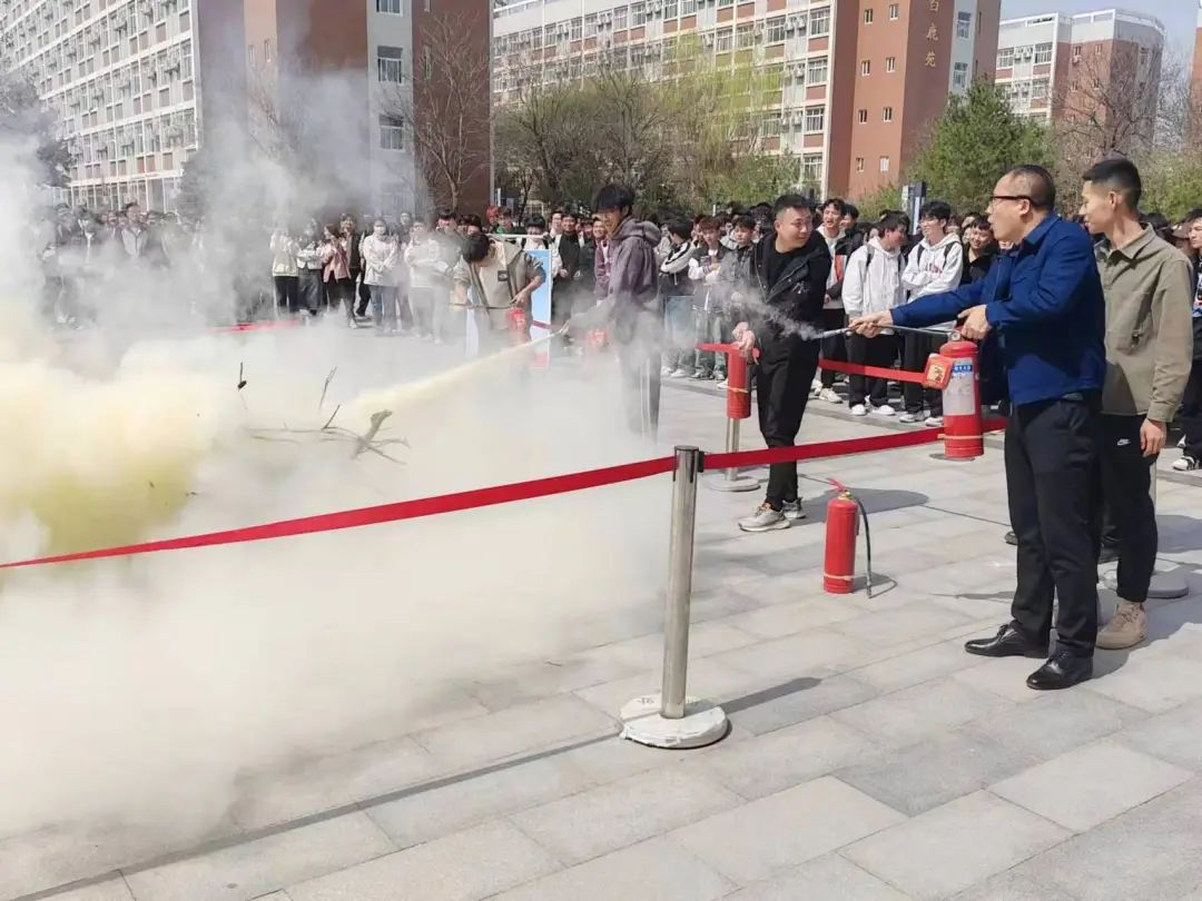 保卫处副处长刘士元详细介绍了消防安全基本知识、火灾现场应急处置、基本逃生技巧,紧接着拿起灭火器,为现场所有代表介绍灭火器的种类以及使用方法,随后按下灭火器阀门,演示消防器材的使用要领和训练方法,并在现场召集学生现场进行培训,很快将现场模拟火源扑灭。