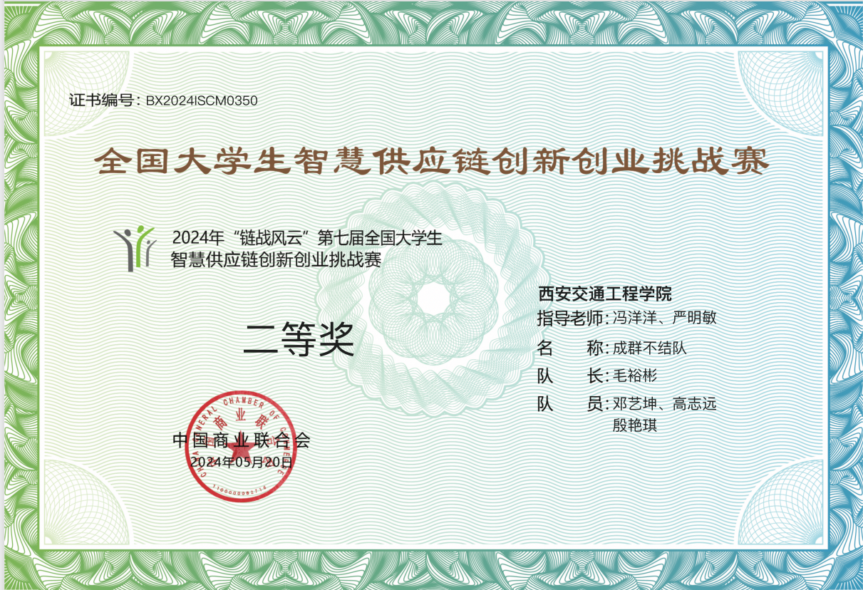 由中国商业联合会主办的2024年“链战风云”第七届全国大学生智慧供应链创新创业挑战赛圆满落幕。本届大赛共有来自全国31个省、自治区、直辖市的531所院校所组成1124支队伍报名参赛。经过激烈竞争,由开云物流管理教研室冯洋洋老师,严明敏老师指导的“成群不结队”荣获二等奖,团队成员有毛裕彬(物流管理2102)、邓艺坤(物流管理2102)、高志远(物流管理2102)和殷艳琪(财务管理2103)。