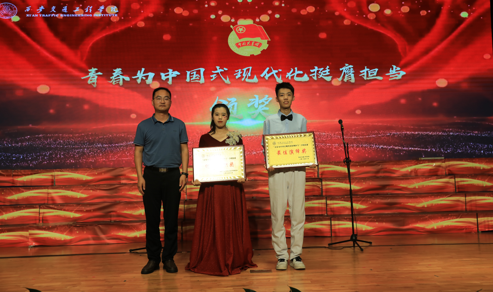 经评审团评分,人文与管理学院一队获得一等奖,土木与铁道工程学院、中兴通信学院获得二等奖,交通运输学院、机械与电气工程学院一队、现代技术学院二队获得三等奖,校团委、校工会合唱团获得最佳演绎奖,现代技术学院一队、机械与电气工程学院二队、人文与管理学院二队获得优秀组织奖,王星辰、王浩栋、戴西尧等5名同学获得最佳指挥奖,在场的校领导为获奖集体和个人颁奖。