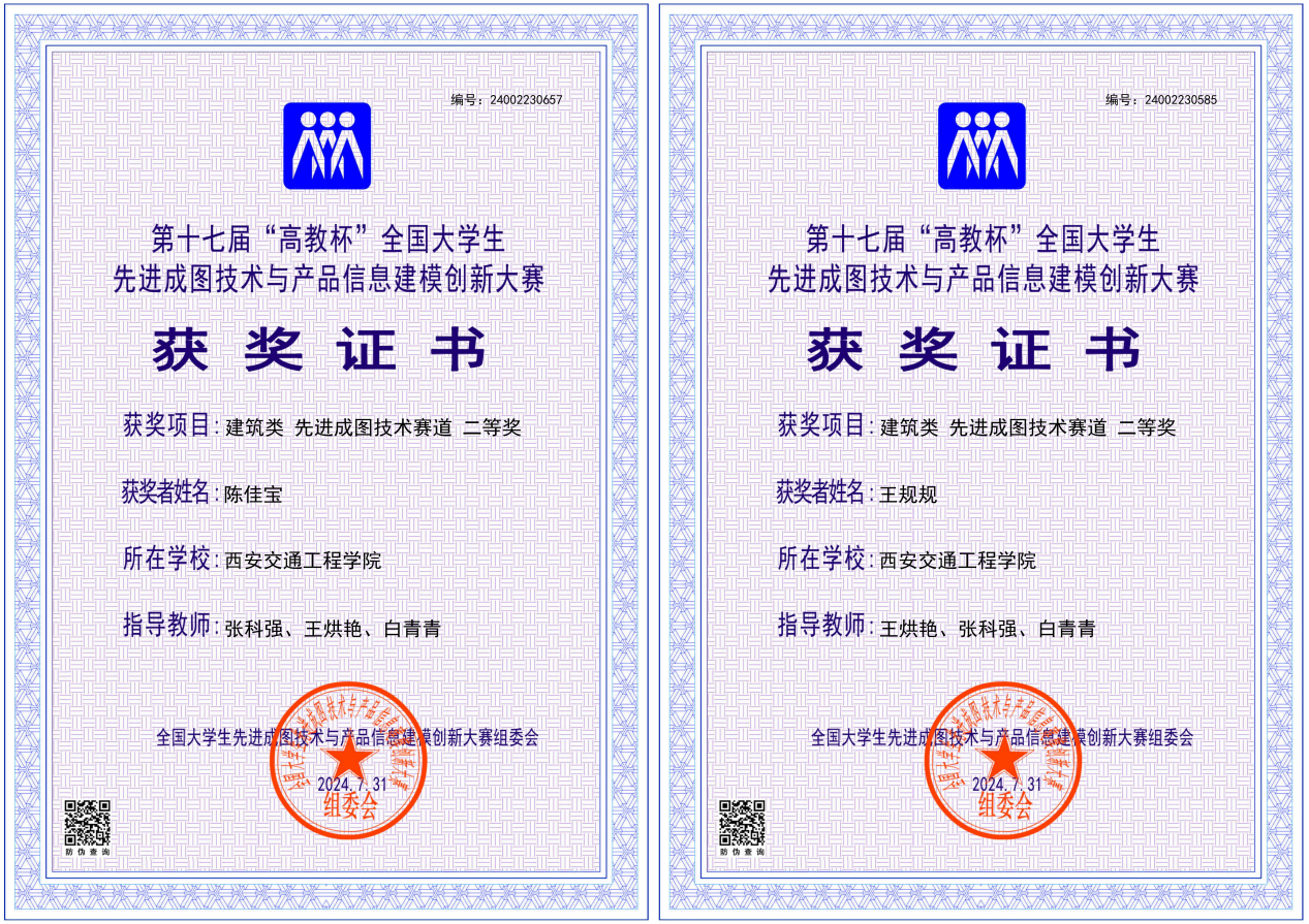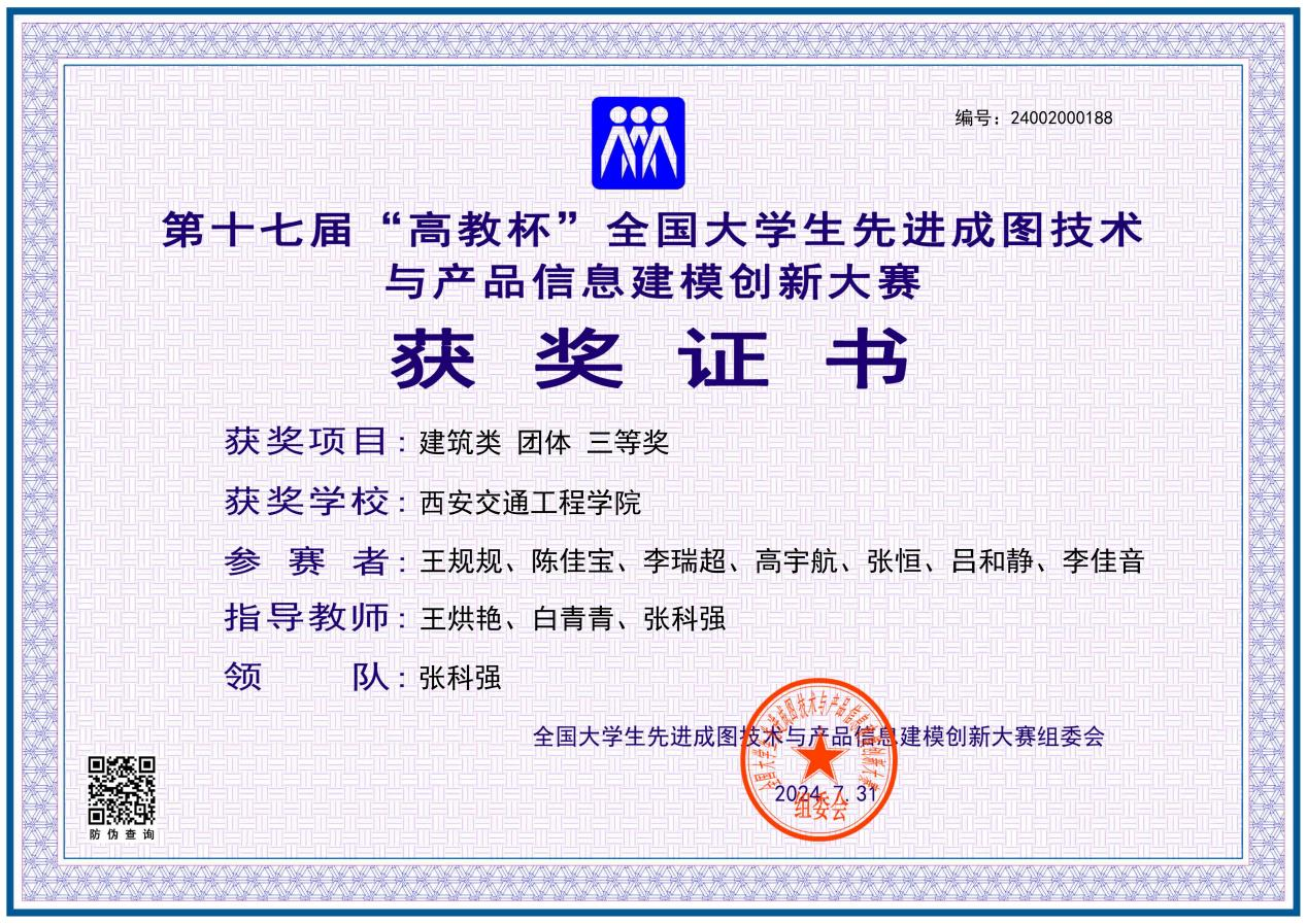 土木与铁道工程学院由张科强、王烘艳和白青青三位教师指导的10名学生代表学校参加全国总决赛。经过激烈角逐,王规规、陈佳宝2名同学分别获得建筑类先进成图技术赛道二等奖,高宇航、李瑞超、张恒、陈泽坤4名同学分别获得建筑类先进成图技术赛道三等奖;王规规、陈佳宝、李瑞超、高宇航、张恒、陈泽坤、吕和静、李佳音7名同学获得全国总决赛建筑类团体三等奖;张科强、王烘艳、白青青三位教师分别获优秀指导教师三等奖。