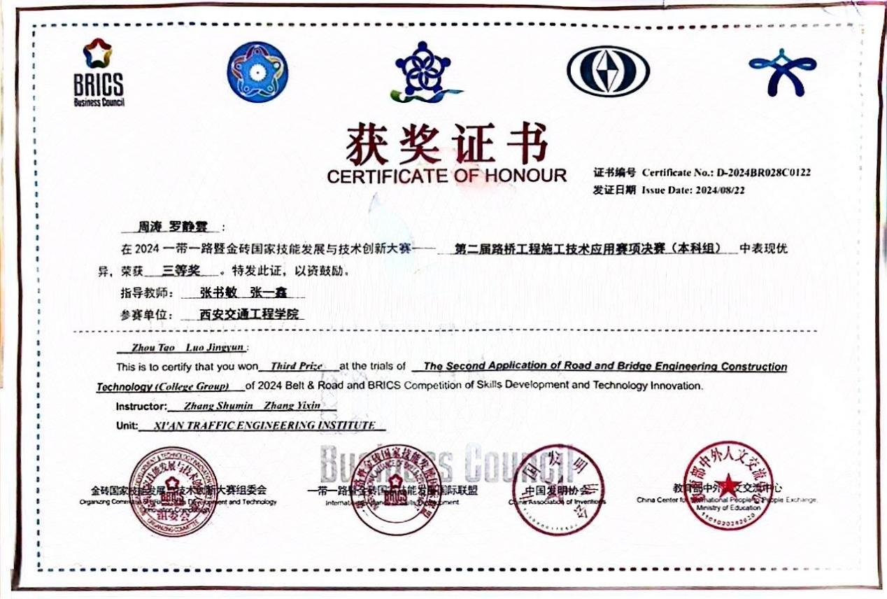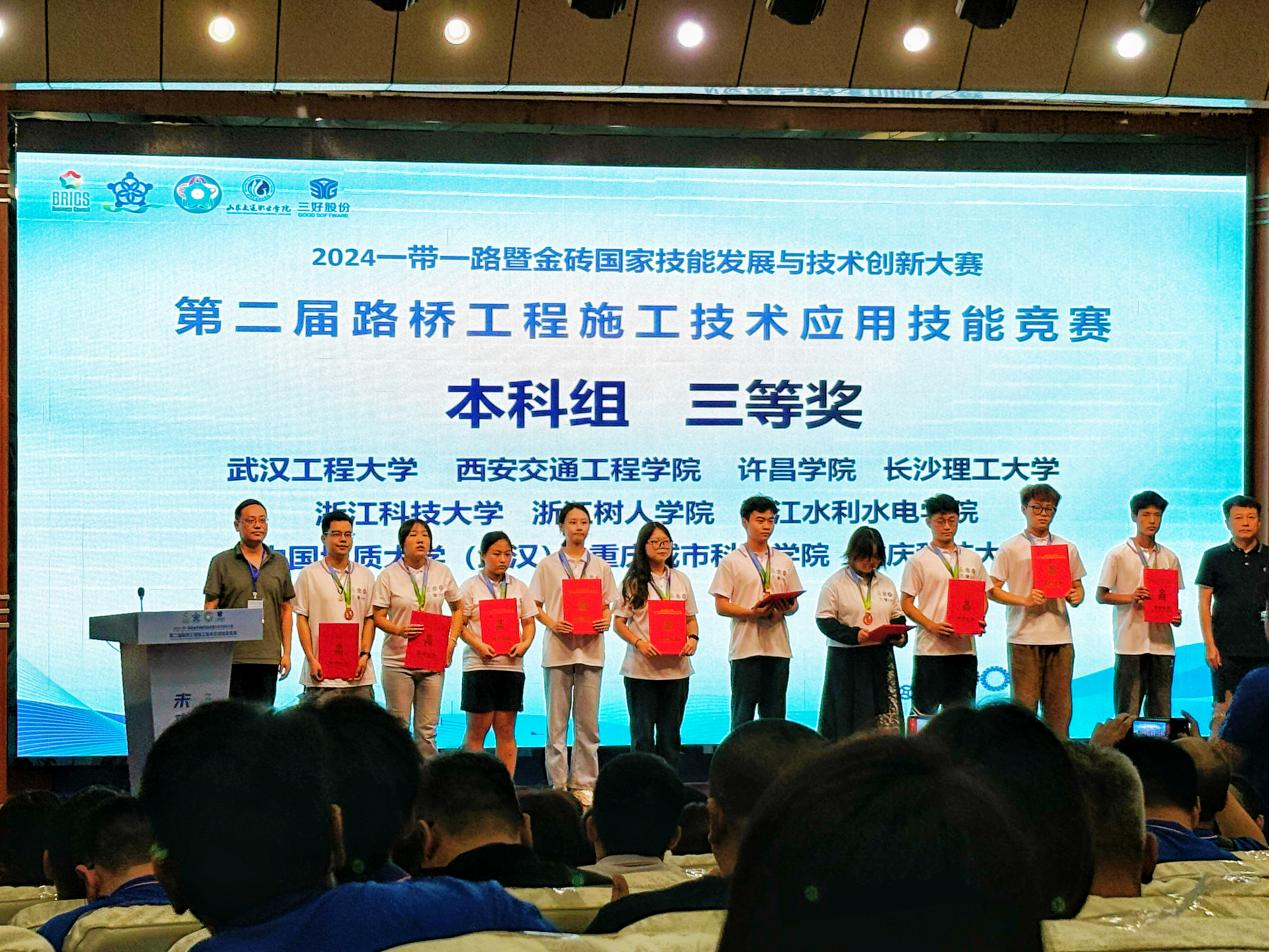 8月20日-22日,2024一带一路暨金砖国家技能发展与技术创新大赛第二届路桥工程施工技术应用赛项(BRICS-ST-028)全国总决赛在山东潍坊举行。本次路桥赛项决赛经过前期覆盖全国院校的校园赛,到665所院校参与的区域选拔赛,最终决出来自全国的200余所院校参与角逐,共有包括国际选手在内的282支队伍的千余人参加此次决赛。开云土木与铁道工程学院周涛、罗静雲两位同学参加此次比赛,最终荣获本科组全国三等奖。