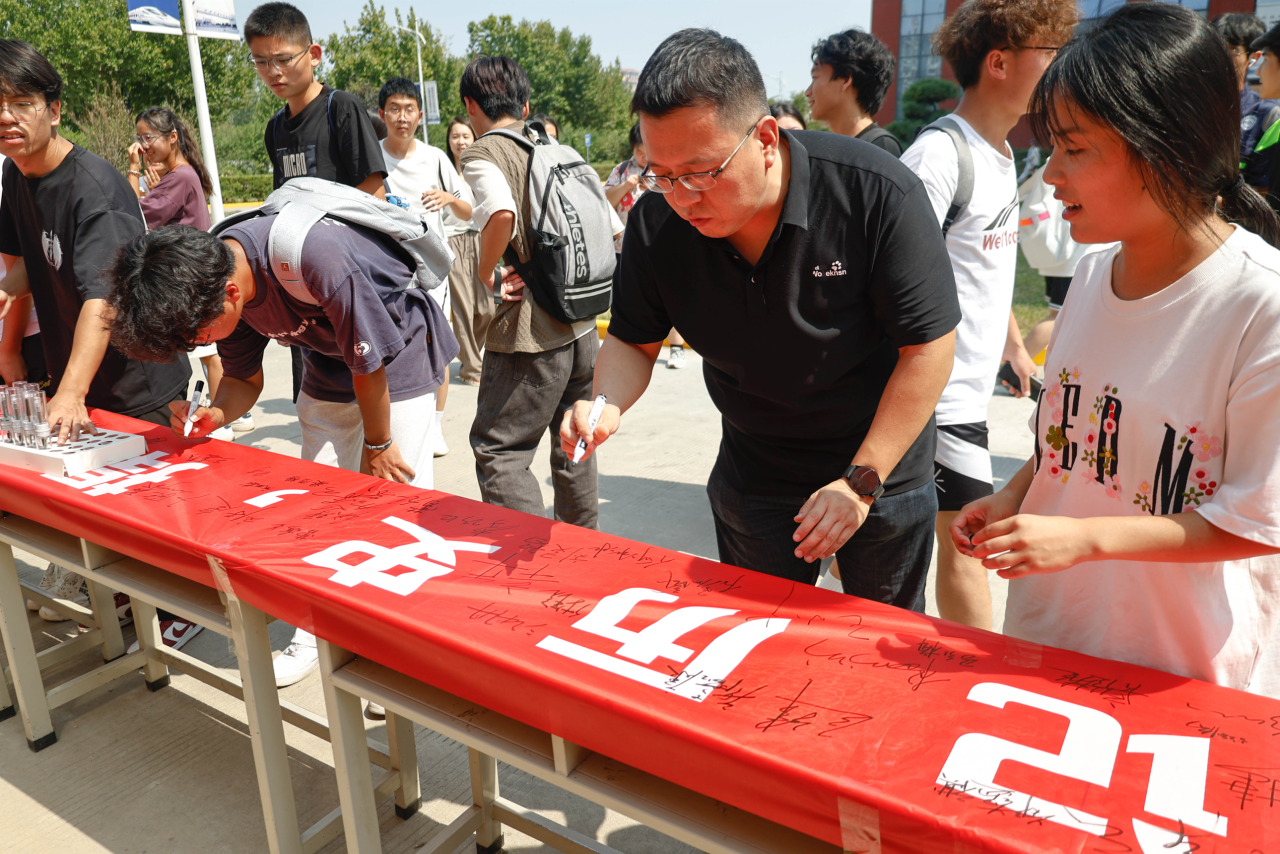 师生们神情严肃,在“铭记历史,捍卫和平;吾辈自强,砥砺前行”标语的横幅上以名为誓,笔画间都是对先辈的敬仰和对未来的期许。
