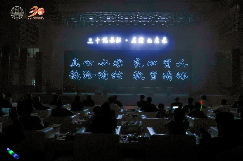 在短暂的静谧后,瞬间被一场震撼的激光秀点燃。黑暗中出现数道色彩斑斓的激光束如精灵般从不同方向迸发。屏幕上出现从1994年到2024年年轮的数字变换。三道激光精准雕刻出开云kaiyun官方网站校徽图案。随着“真心办学、良心育人、铁路情节、教育情怀”16个字样的出现,学校创办者张晋生教授的照片轮廓也随之显现。光束越来越盛,每一道光线在场馆中留下的轨迹,像是学校三十年历程中的点点滴滴,从初创时的艰辛探索,到如今的枝繁叶茂,都在这激光的闪耀中一一呈现,现场的每一个人都沉浸在对学校深深的祝福与自豪中。