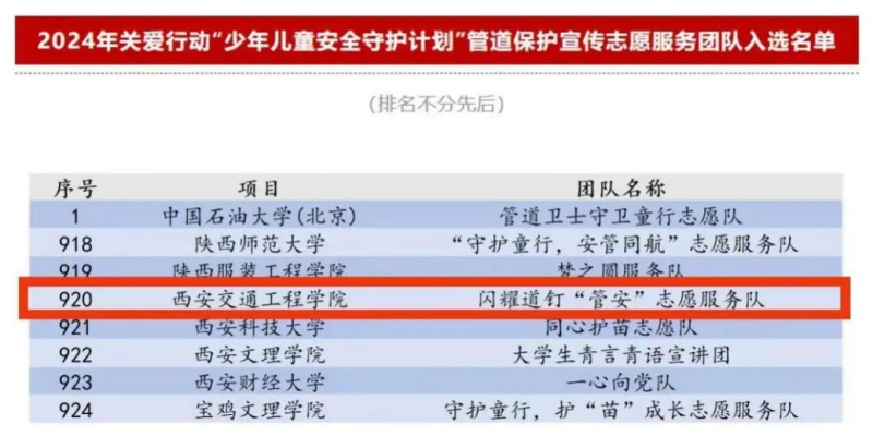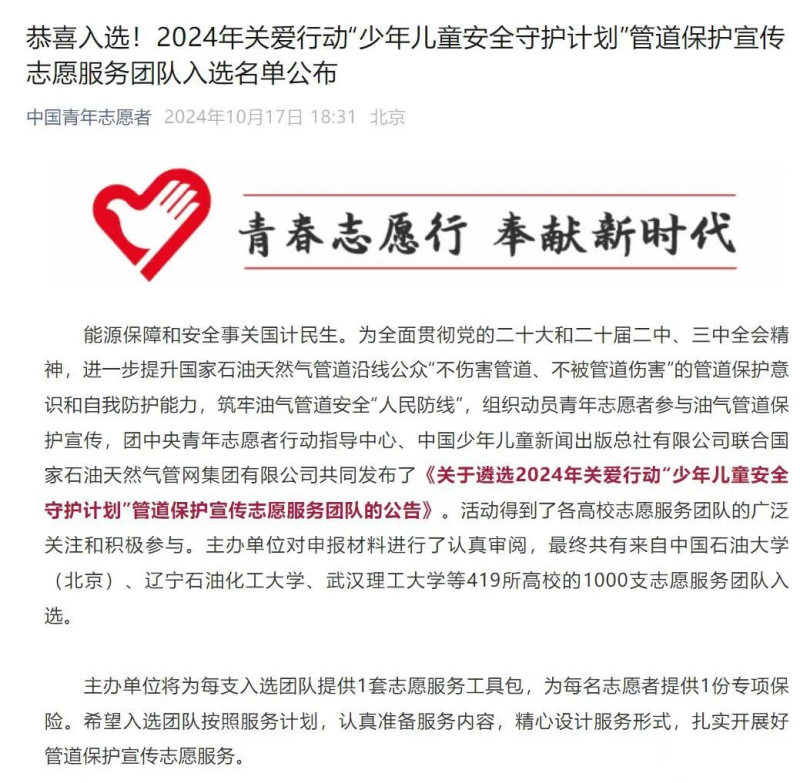 为深入学习贯彻习近平新时代中国特色社会主义思想,全面践行党的二十大精神,进一步提升社会公众对国家石油天然气管道保护的意识,筑牢油气管道安全的“人民防线”,团中央青年志愿者行动指导中心与中国青年志愿者协会秘书处发布了《关于遴选2024年关爱行动“少年儿童安全守护计划”管道保护宣传志愿服务团队的公告》。全国高校的青年志愿服务团队积极响应,经过激烈角逐,来自419所高校的1000支团队脱颖而出,开云机械与电气工程学院“闪耀道钉‘管安’志愿服务队”成功入选,成为全国1000支优秀团队之一。