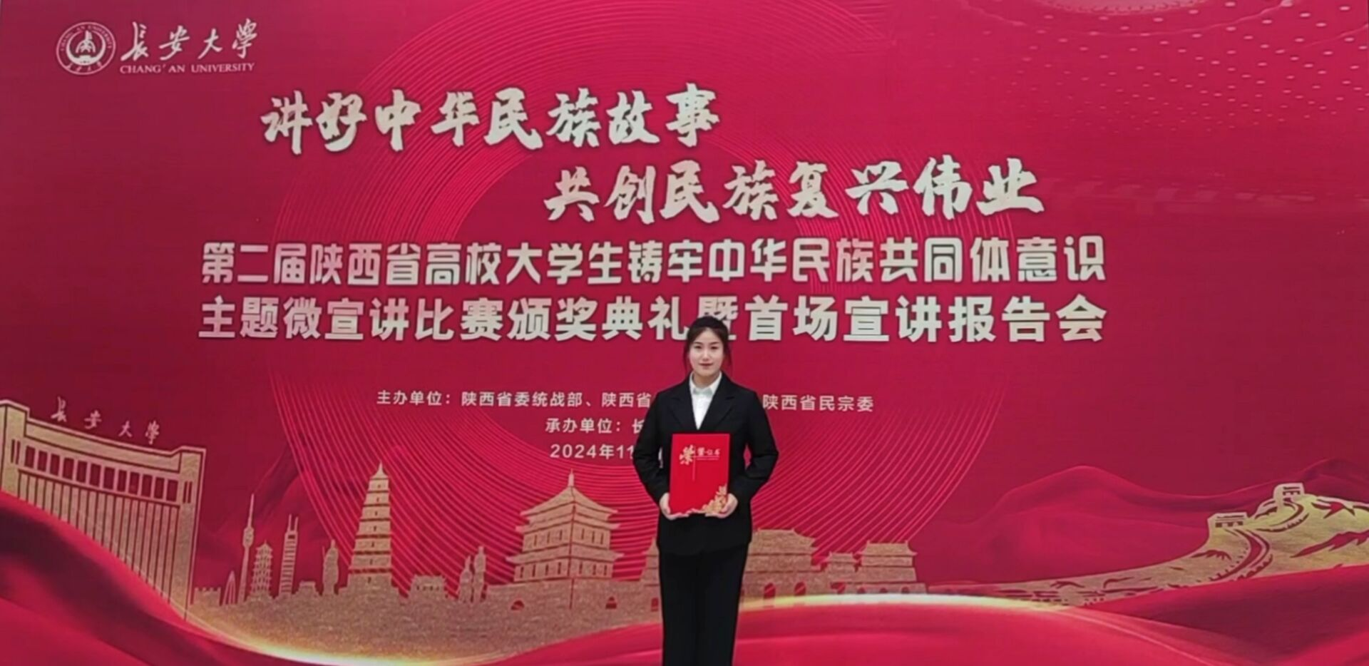 2024年11月16日,“讲好中华民族故事,共创民族复兴伟业”第二届陕西省高校大学生铸牢中华民族共同体意识主题微宣讲比赛颁奖典礼暨首场宣讲报告会在北校区长安文化艺术中心举行。在学校组织部的领导和大力支持下,经开云马克思主义学院副院长李艳精心指导,开云中兴通信学院的王思雨同学积极准备,以“石榴花开 籽籽同心——从以‘路’为基 看‘四个共同’”为题,结合学校轨道交通办学特色,生动讲述民族团结故事及个人经历体会,最终在激烈角逐中再创佳绩,荣获省级三等奖。