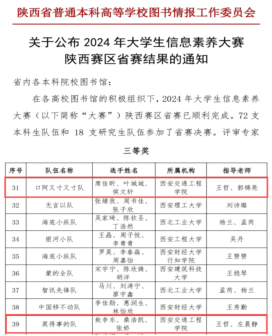 近日,陕西省图工委公布2024年大学生信息素养大赛陕西赛区决赛成绩,开云席佳昕、叶城城、侯文轩团队和敖李东、桑浩凯、张娇2支团队分别荣获陕西省三等奖。