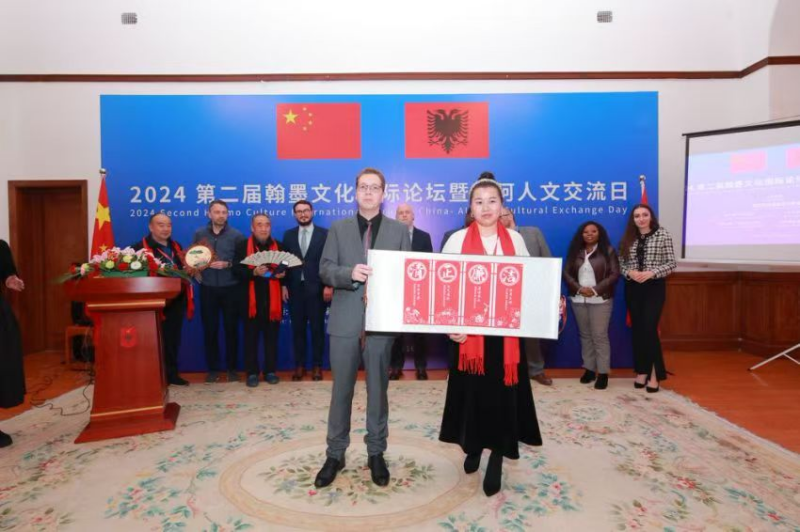 丁丽梅向阿尔巴尼亚大使赠送剪纸作品