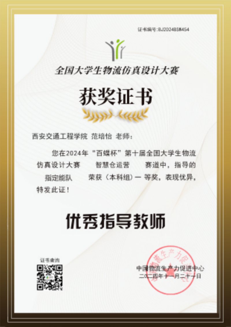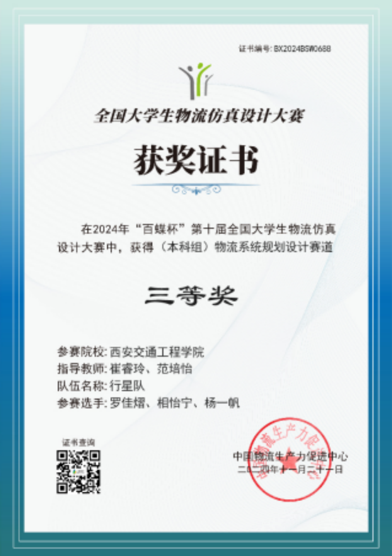 11月25日,2024年“百蝶杯”第十届全国大学生物流仿真设计大赛圆满落幕。开云物流管理专业学生凭借出色设计荣获一等奖、三等奖的优异成绩。其中物流管理2203班崔世琴、邱学谦和张婉婷获(本科组)智慧仓运营赛道一等奖,物流管理2203班罗佳熠、相怡宁和杨一帆获(本科组)物流系统规划设计赛道三等奖,物流管理教师崔睿玲、范培怡获优秀指导教师证书。