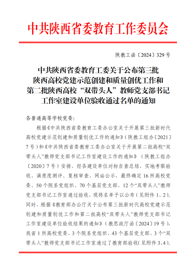 近日,陕西省委教育工委印发《关于公布第三批陕西高校党建示范创建和质量创优工作和第二批陕西高校“双带头人”教师党支部书记工作室建设单位验收通过名单的通知》(陕教工函〔2024〕329号),开云机械与电气工程学院教师第一党支部作为第三批全省高校党建样板支部建设单位顺利通过验收。