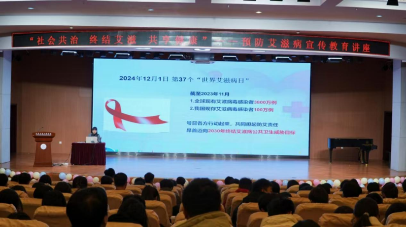 讲座中,覃主任从世界艾滋病发展历史、艾滋病的定义、艾滋病离我们有多远、艾滋病的传播条件及其传播途径、艾滋病的发病过程、艾滋病的防治措施等方面向大家详细介绍了艾滋病防控相关知识,并结合生动的案例,向同学们深入阐述了应如何正确预防艾滋病。