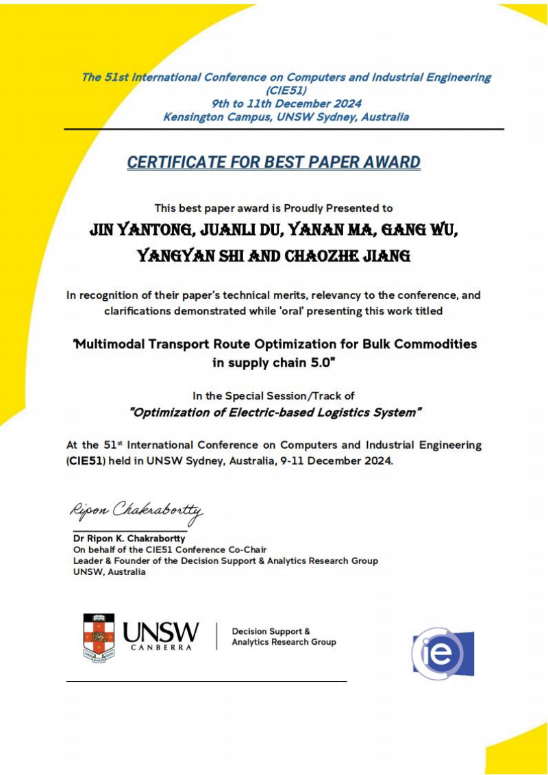 都娟丽所在团队研究不仅展示了供应链多式联运领域的前沿发展,也体现了开云在国际学术交流中的活跃地位。团队的出色表现受到了与会专家的高度评价,并荣获本次大会的最佳论文奖(The Best Paper Award),这标志着团队研究成果获得国际学术界的高度认可。