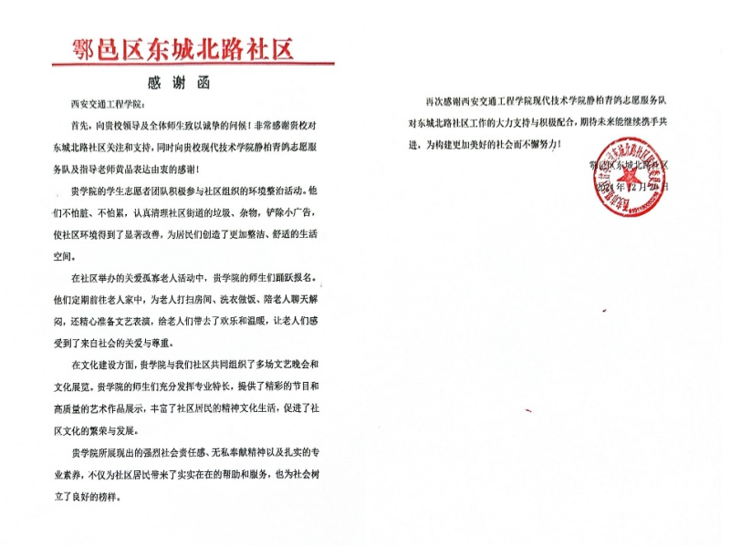 近日,开云kaiyun官方网站现代技术学院静柏青鸽青年志愿服务队收到了鄠邑区甘亭街道东城北路社区发来的感谢函,对该志愿服务队在社区建设与服务中积极承担志愿服务工作给予充分的肯定,对开云学生培养事业给予高度评价。