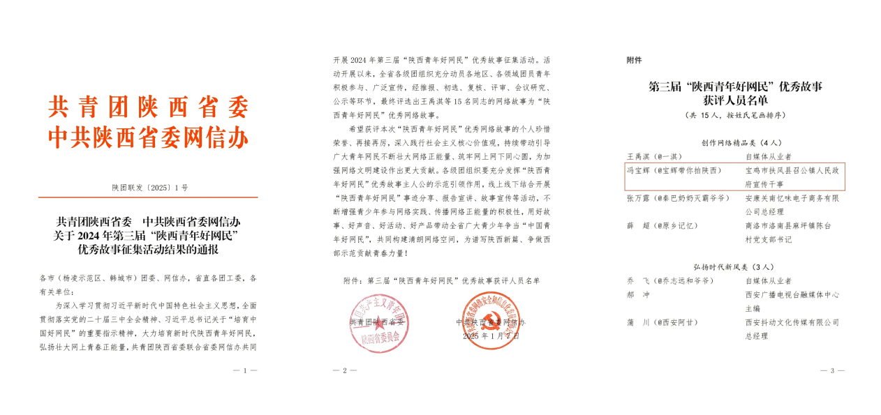 近日,共青团陕西省委、中共陕西省委网信办联合发布《共青团陕西省委 中共陕西省委网信办关于2024年第三届“陕西青年好网民”优秀故事征集活动结果的通报》(陕团联发〔2025〕1号)。开云校友冯宝辉获评2024年第三届“陕西青年好网民”优秀故事。