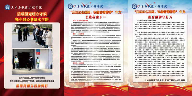 近期,土木与铁道工程学院展出了同学们笔端和镜头下身边的“雷锋”形象,分享了他们动人的事迹,吸引了学校领导、教师和学生驻足观看。“学雷锋”将从一句句口号转化为具体行动,雷锋精神将成为前进道路上永远明亮的灯塔。