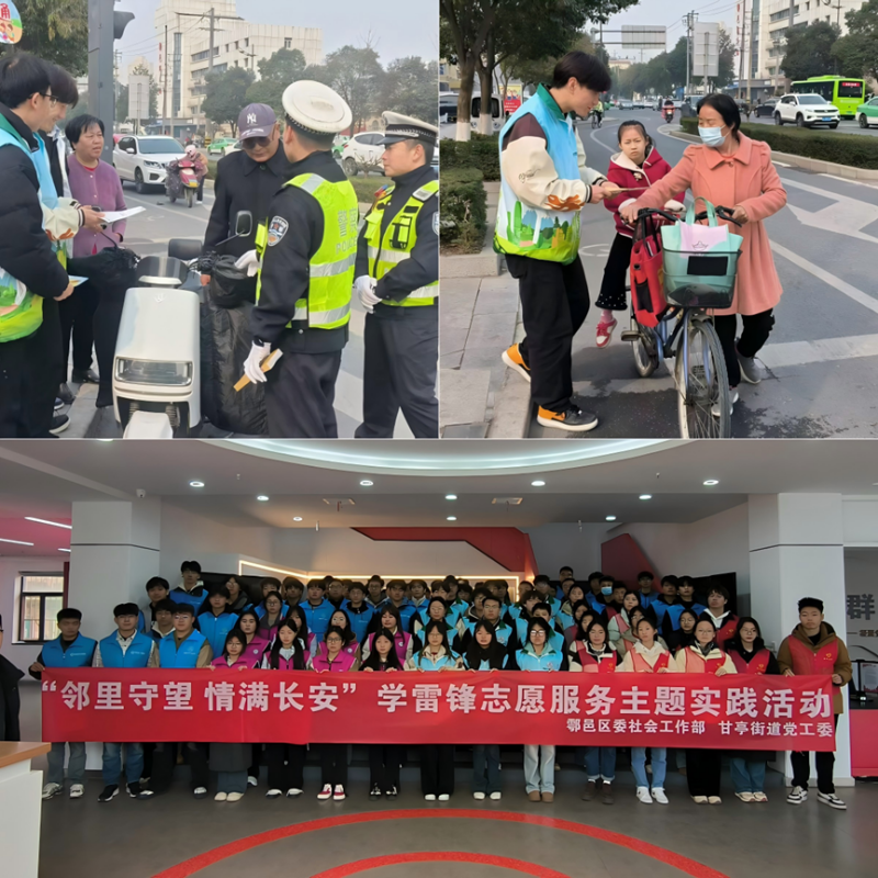 邻里守望,情满长安。土木与铁道工程学院青年志愿者服务队联合鄠邑区人民路社区志愿者、鄠邑区交警大队,共同开展了学雷锋志愿服务主题实践活动。活动启动仪式在鄠邑区人民路中心广场举行,志愿者们进行了集体宣誓。在人民路与丰京路交叉口,学生志愿者与交警协作,通过“宣传+劝导”双模式开展工作,向电动车骑行者发放《交通安全手册》,并结合真实事故案例讲解未佩戴头盔的危害;针对部分老人不熟悉交通信号灯的情况,志愿者采用“手语引导+慢速陪护”方式协助过马路,用实际行动诠释了雷锋精神的温暖与力量。
