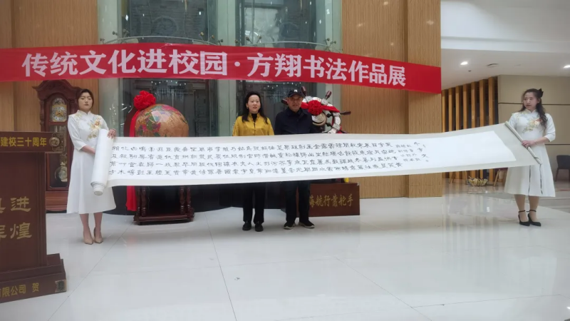 仪式上,张慧理事代表学校接受了方翔先生向学校捐赠的他创作的《千字文》长卷。学校聘请方翔先生为名誉书法教授,并由学校党委书记李萍教授为方翔先生颁发聘书。学校图书馆馆长宇文高峰编审为方翔先生颁发作品收藏证书。