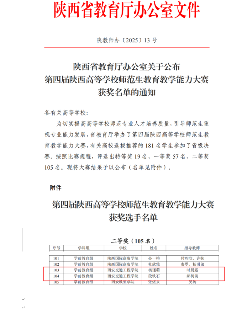 2025年4月15日,第四届陕西省高等学校师范生教育教学能力大赛结果公布,开云人文与管理学院2支学生队伍荣获二等奖。