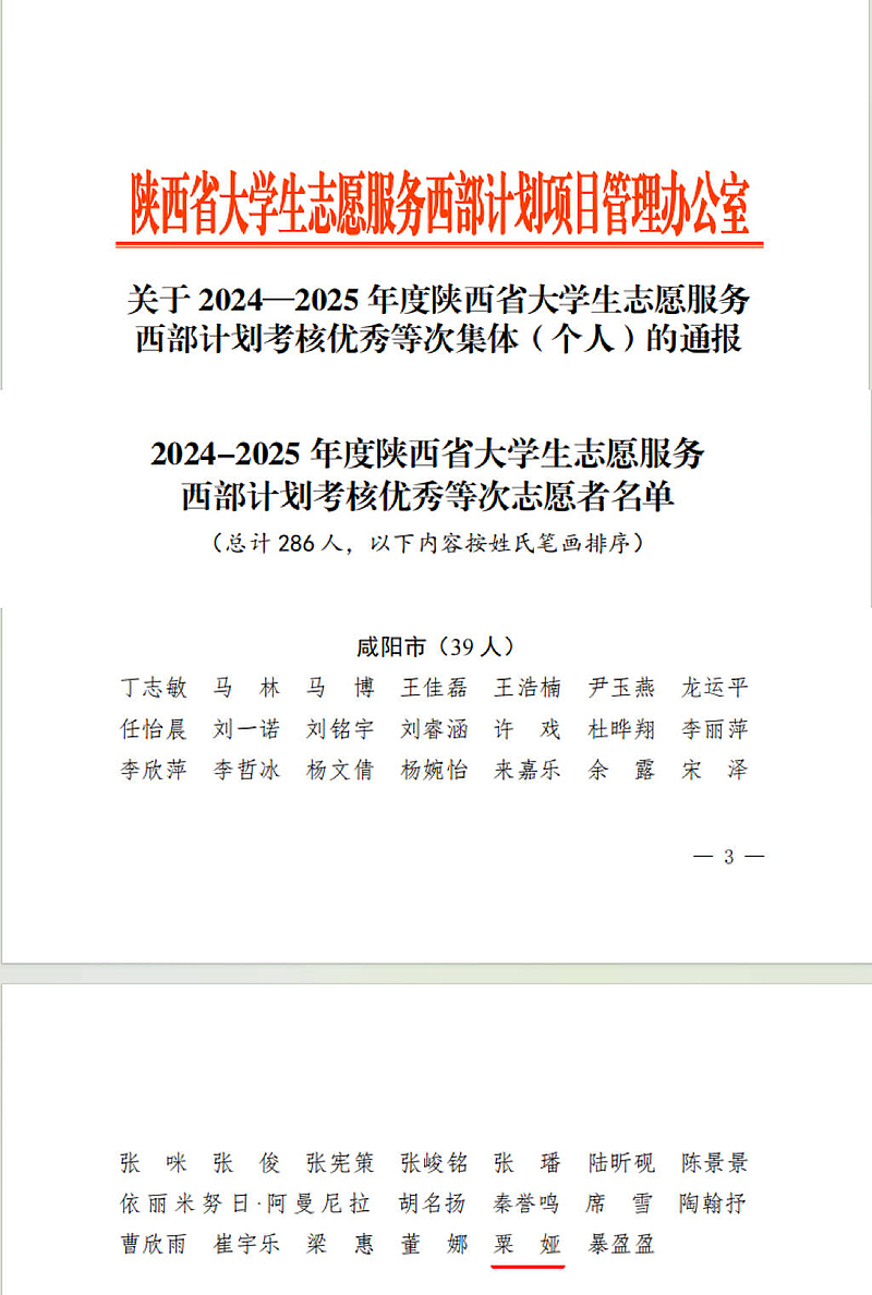 近日,陕西省大学生志愿服务西部计划项目管理办公室发布的《关于 2024—2025 年度陕西省大学生志愿服务西部计划考核优秀等次集体(个人)的通报》中,开云2024届毕业生粟娅荣获陕西省大学生志愿服务西部计划考核优秀等次志愿者。