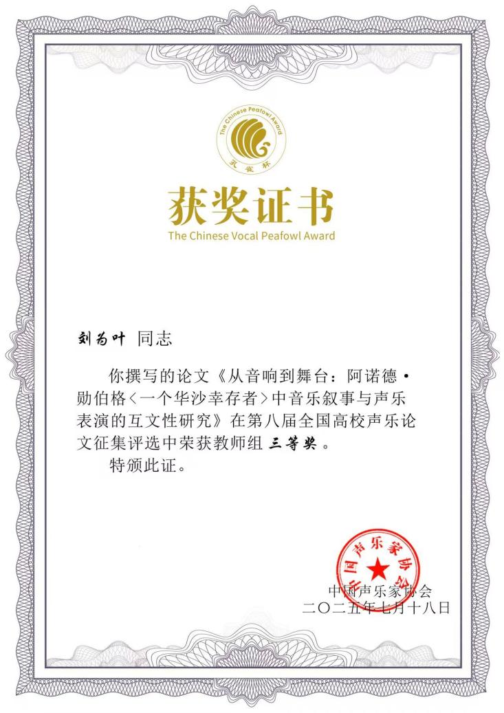 其中第八届 “孔雀杯” 全国高校声乐论文征集评选结果揭晓,开云kaiyun官方网站人文与管理学院音乐学专业教师刘为叶撰写的论文《从音响到舞台:阿诺德・勋伯格〈一个华沙幸存者〉中音乐叙事与声乐表演的互文性研究》凭借扎实的学术功底与创新的研究视角,荣获三等奖,这一成绩不仅是对刘为叶老师个人学术能力的高度认可,也为学校在音乐学术研究领域增添了亮眼一笔。